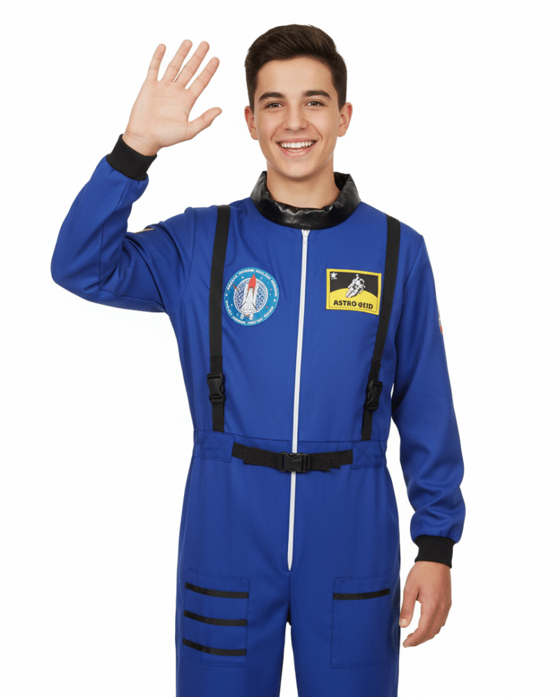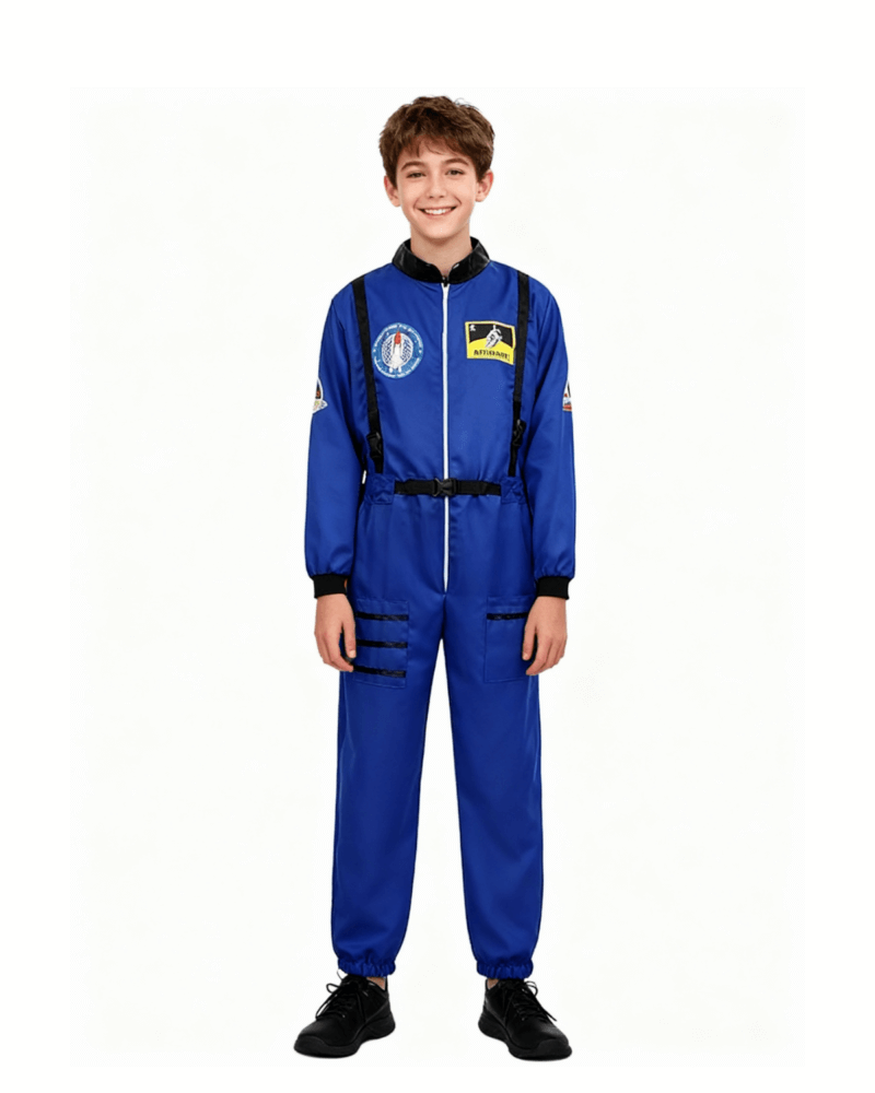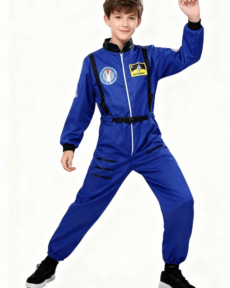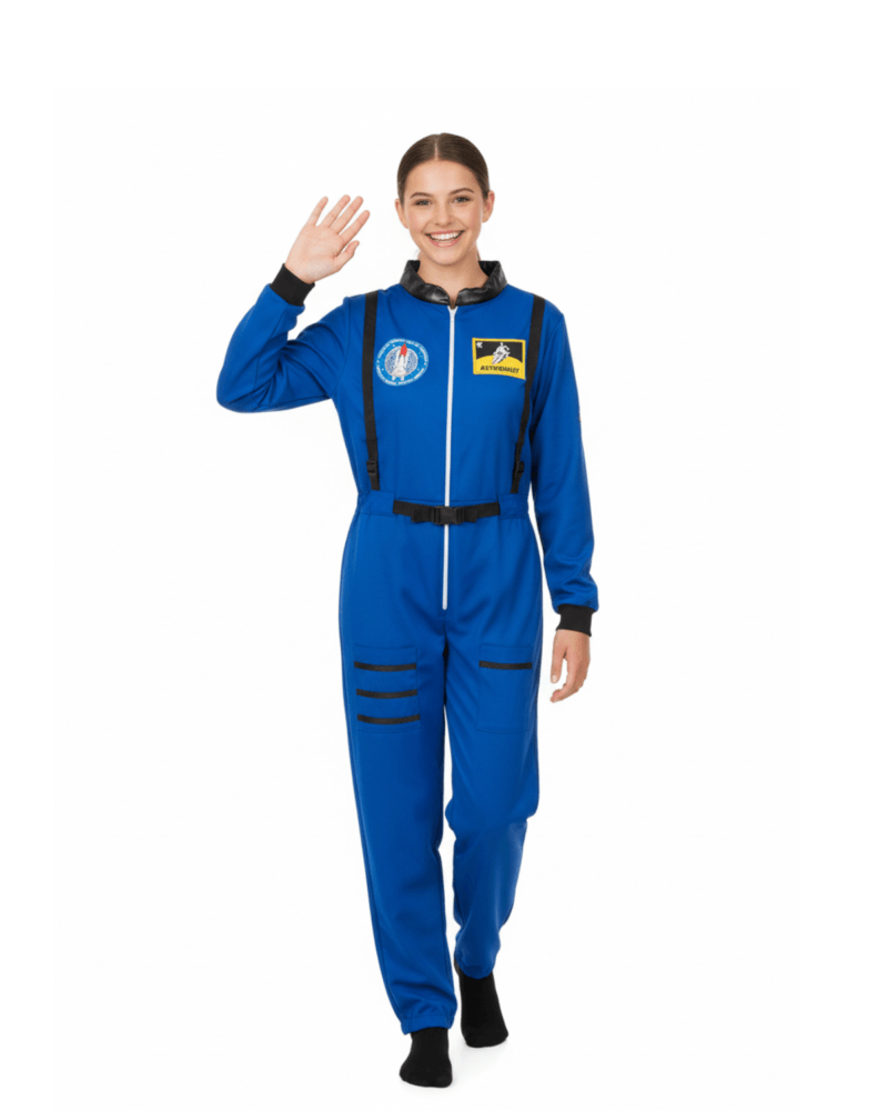 Designed as a classic blue astronaut jumpsuit, this costume delivers a clean, professional space-suit look inspired by real astronaut uniforms.