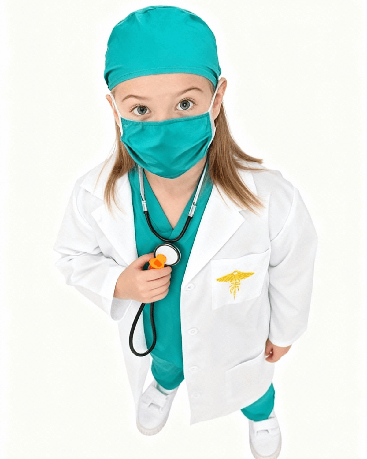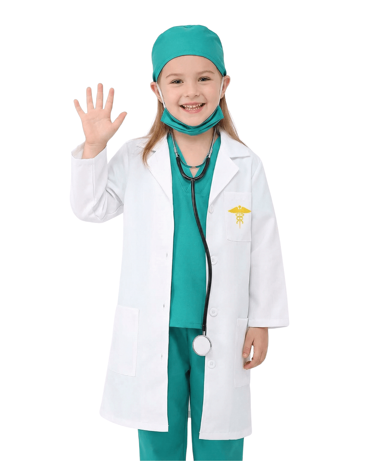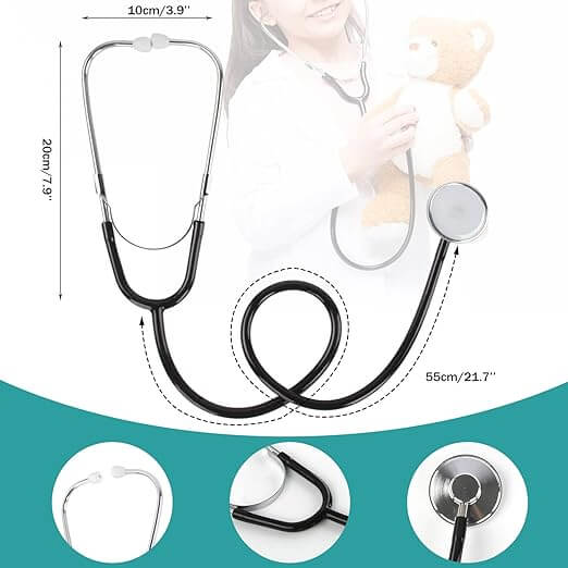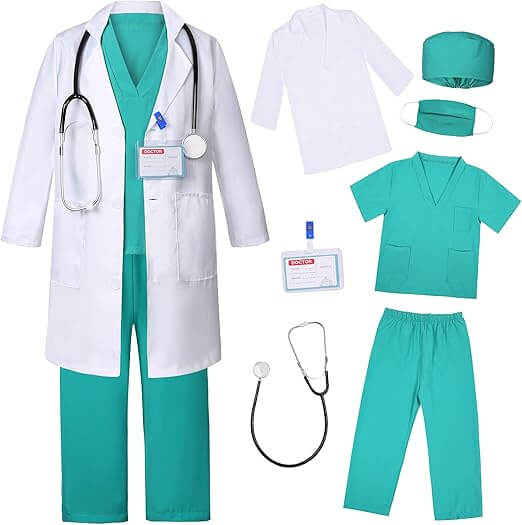 - 【6 in 1 Sets】- This kids doctor costume set includes 1 white doctor coat with print on chest, V-neck and half sleeve top, pants, facemask,1pc long black and silver stethoscope.The materials of this set is very soft and comfortable for kids wearing, Perfect Gift for Kids who want to be a Great medical staff.