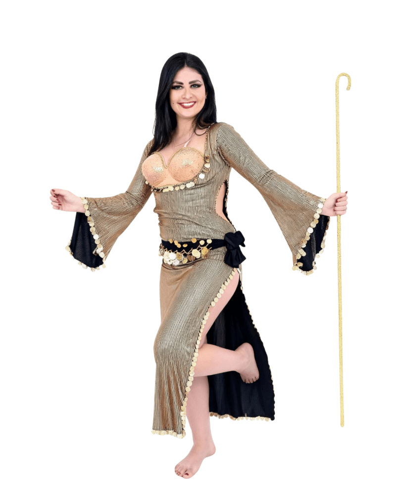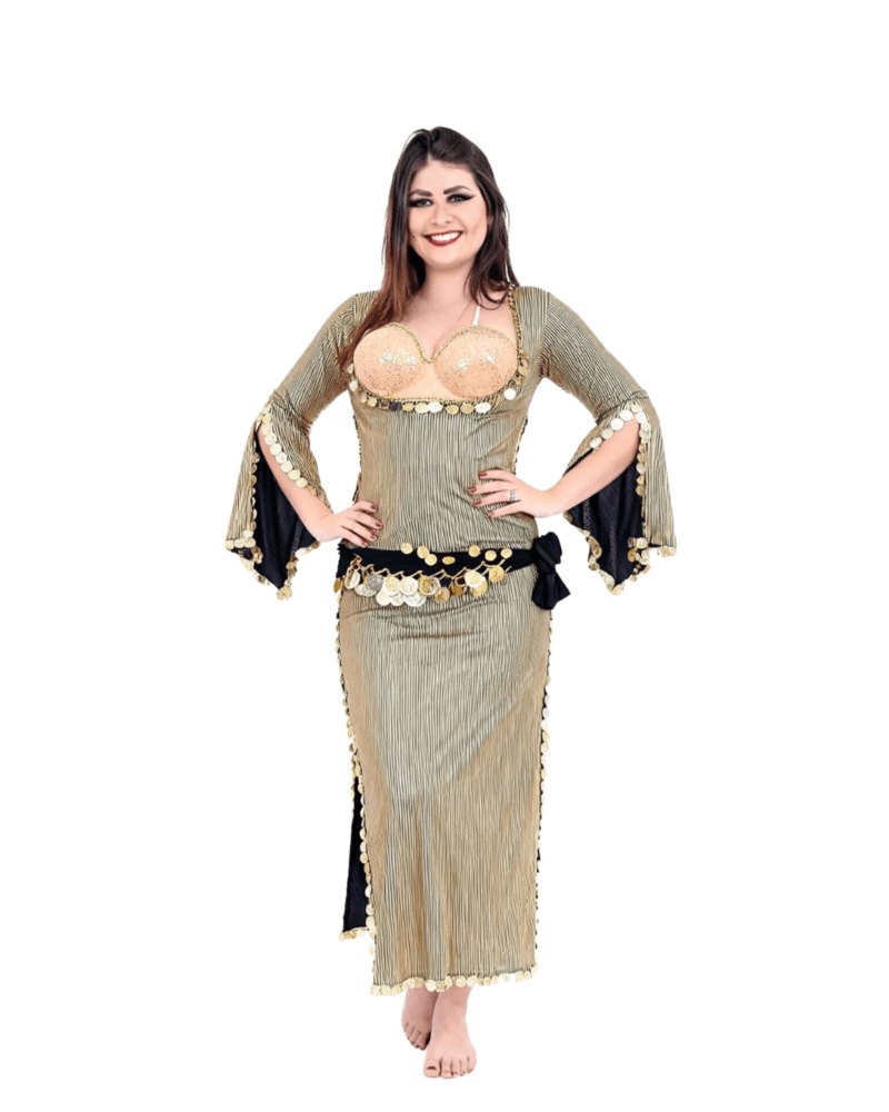 This oriental-inspired outfit features a shimmering gold fabric, beautifully accented with coin embellishments that add movement, sparkle, and an authentic belly dance feel. The design includes a fitted top, flowing skirt with side slit, and dramatic sleeves, creating a graceful silhouette that flatters the body while allowing freedom of movement.