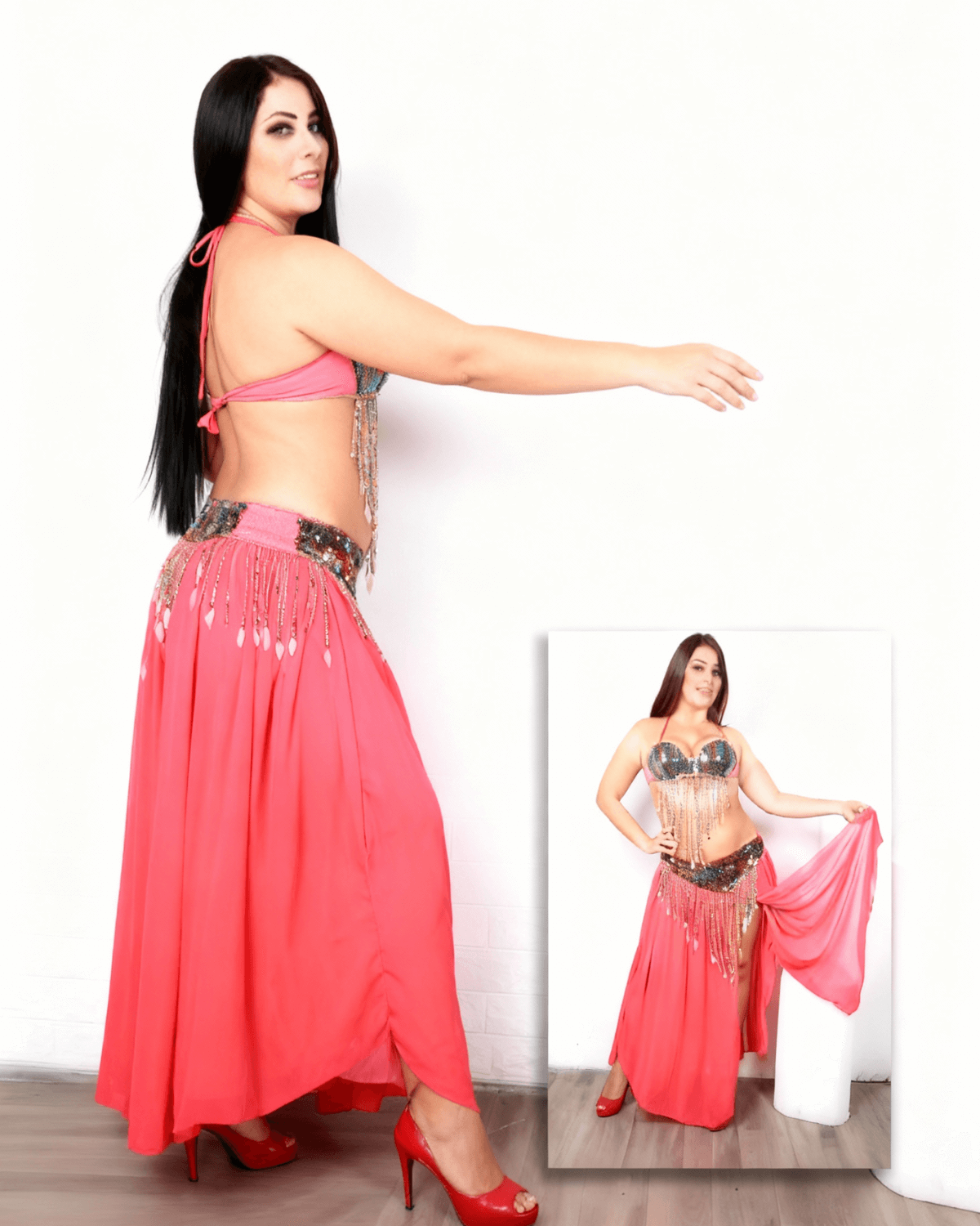 This eye-catching oriental outfit features a sequin-embellished bra top, decorative beaded fringe details that move beautifully with every step, and a flowing red skirt that adds drama and elegance. The design highlights feminine curves while allowing comfort and freedom of movement, making it ideal for dance routines and long performances.